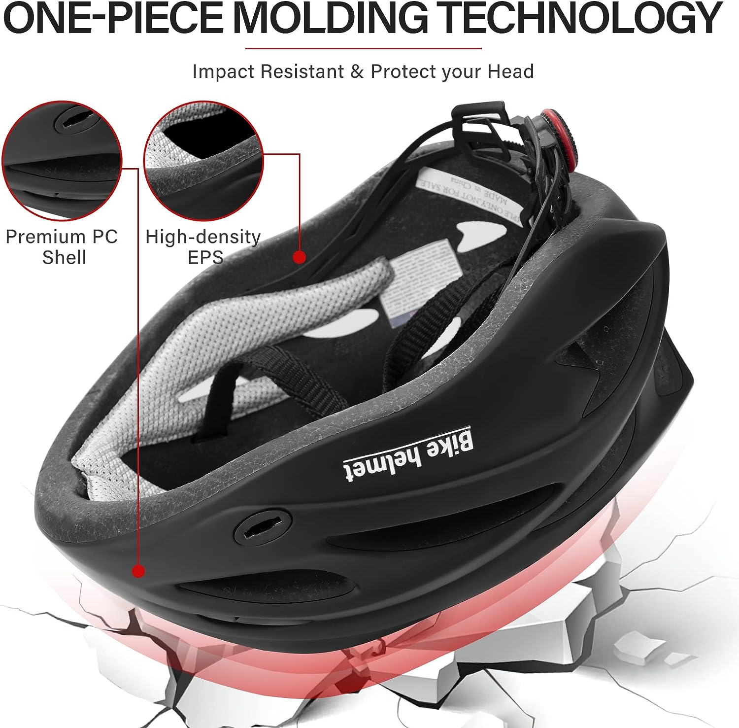 - 【In-Mold Design】Our bike helmets meet the US CPSC, EU CE bicycle helmet safety standards. Made of high-quality EPS foam and PC shell with one-piece molding technology, it effectively absorbs impact energy, provides better cushioning and shock absorption protection, and minimizes the risk of head injury in a crash.