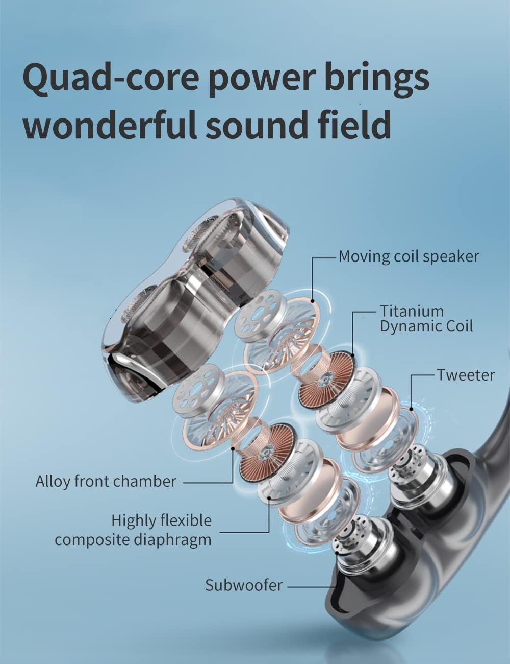- ใCrystal-clear Sound QualityใWith 4pcs 8*5mm speaker and volume-optimized active EQ, the bone conduction headphones keep music sound clear and balanced with deep bass even at max volume, which can bring you the best listening experience. It is the first bone conduction earbuds with quad-core power on the market.