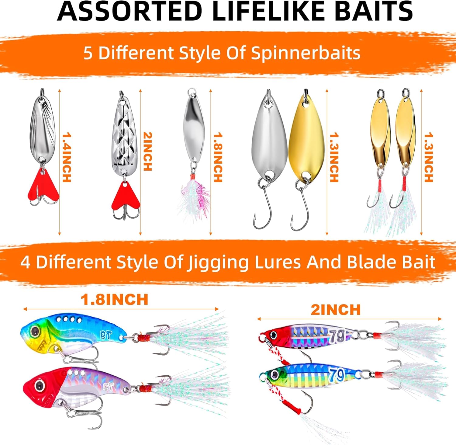 - Ultimate Father's Day Gifts: Surprise your loved father or husband with the all-in-one fishing kit gift! Carefully selected various types of options, including lures (Crankbaits, Popper, Spoon,VIB), different styles of hooks (offset hooks, wacky hooks, treble hooks, etc.), soft plastic, sturdy free tackle box, skill card, tape measure, swivels and other accessories. Reliable quality and complete variety, can be a reliable option for any angler in any water