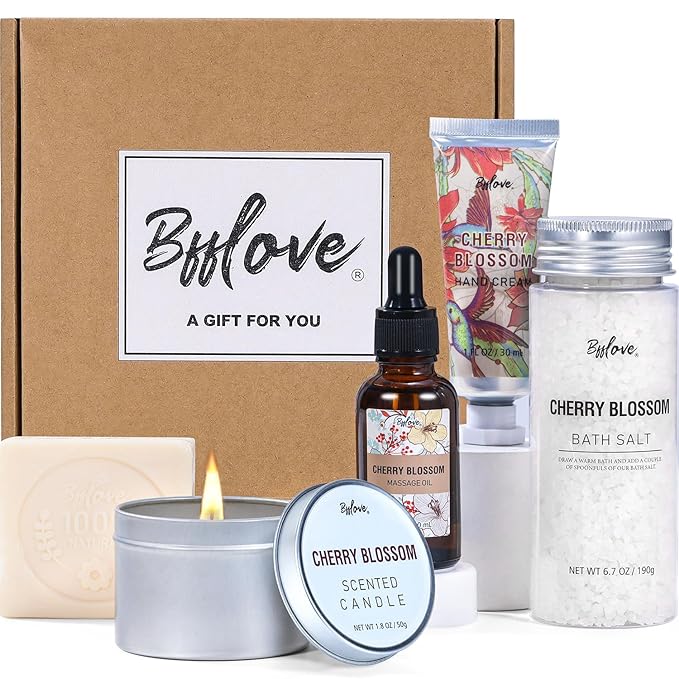 Gifts for Women BFFLOVE Gift Set for Women 5pcs Cherry Blossom Spa Set, Birthday Gifts for Women with Massage Oil, Scented Candle, Bath Salts, Hand Cream, Mothers Day Gifts