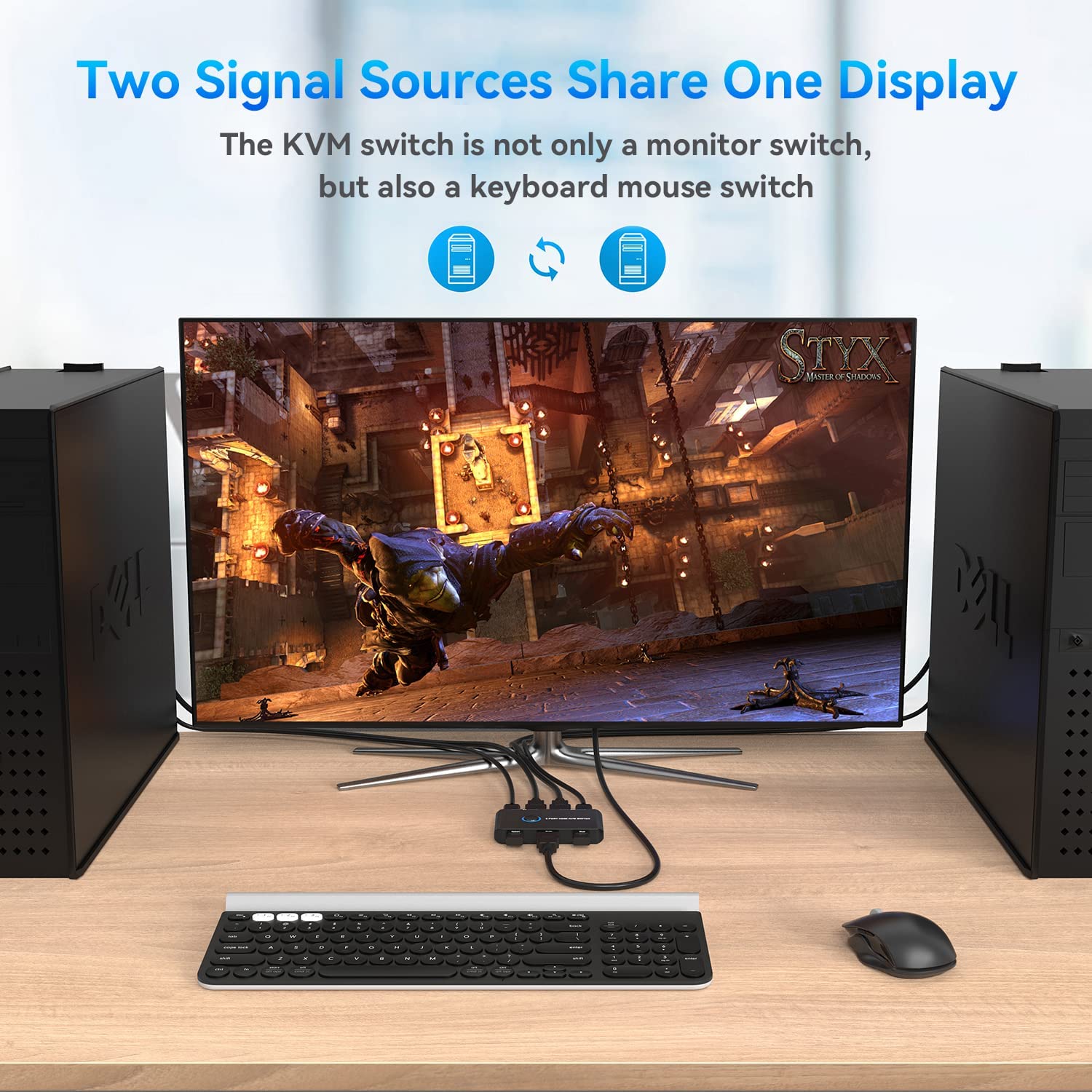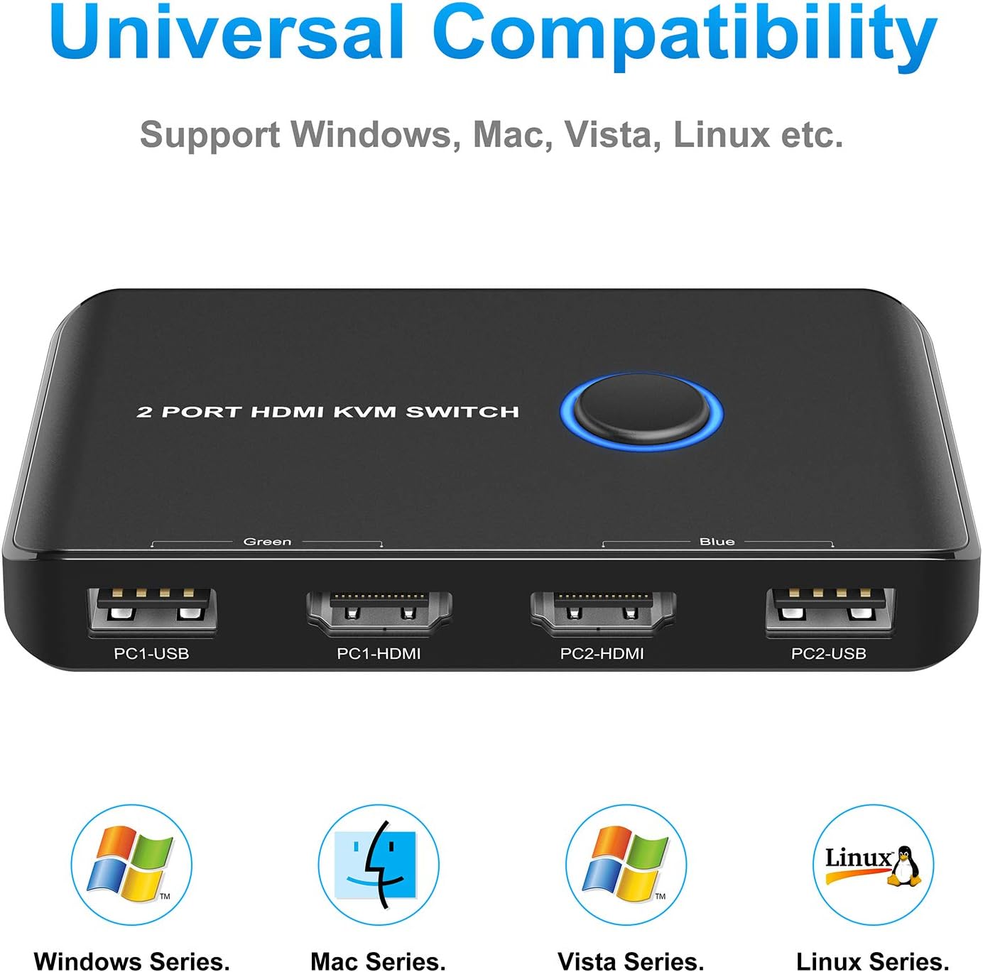 - 【Great Compatibility & One Button Switch】This kvm switch works with great compatibility, driver-free for Windows 10/8/8.1/7/Vista/XP and Mac OS, Linux, and Chrome OS, simply plug and play,No external power required. Easily switch between 2 displays by a single click on the button.