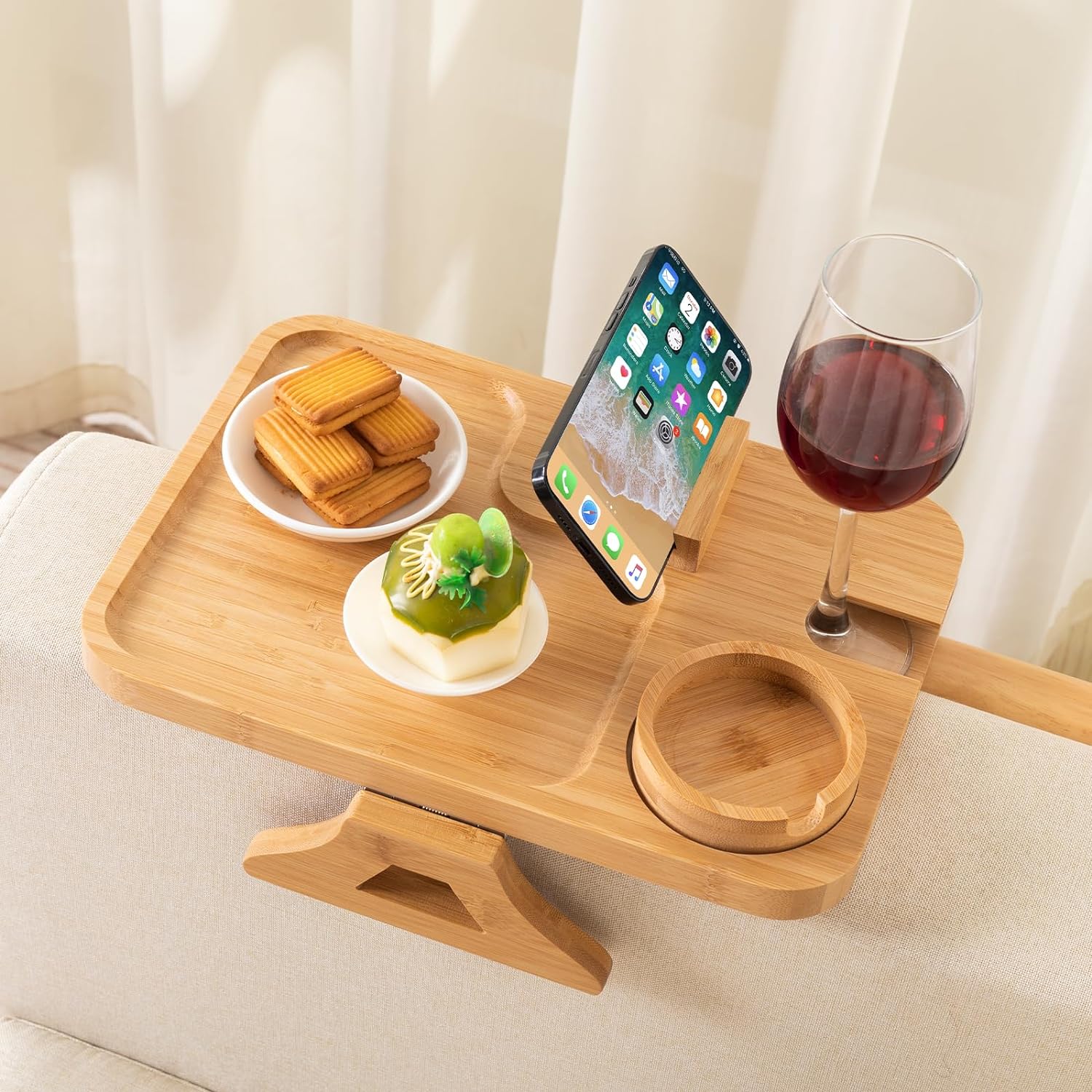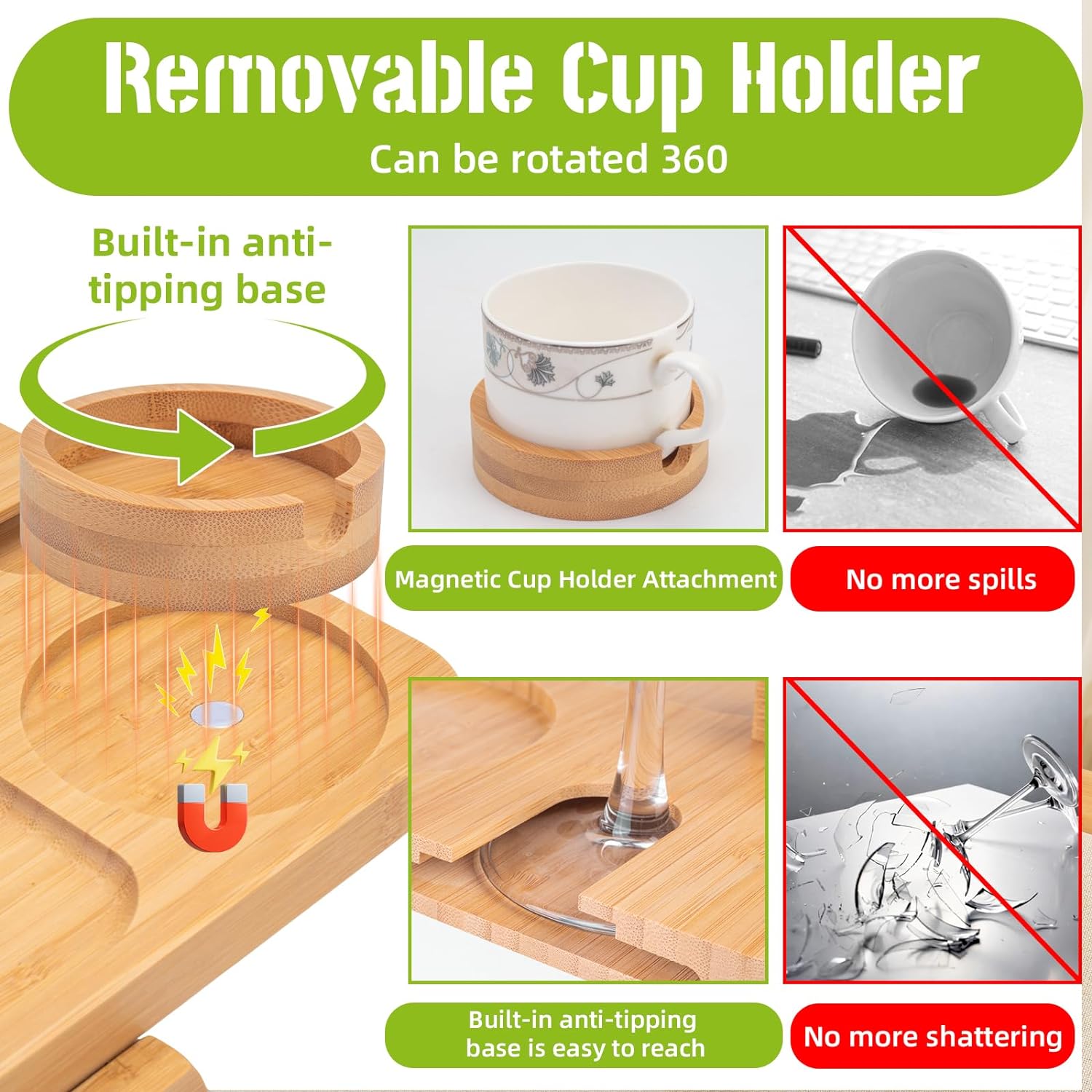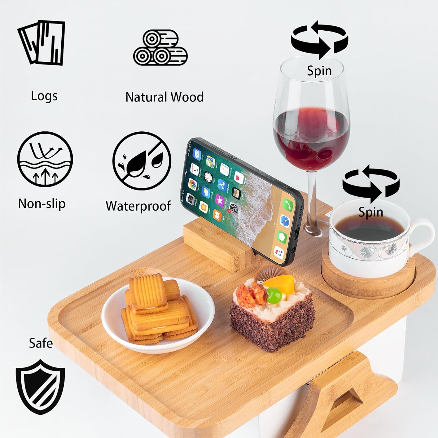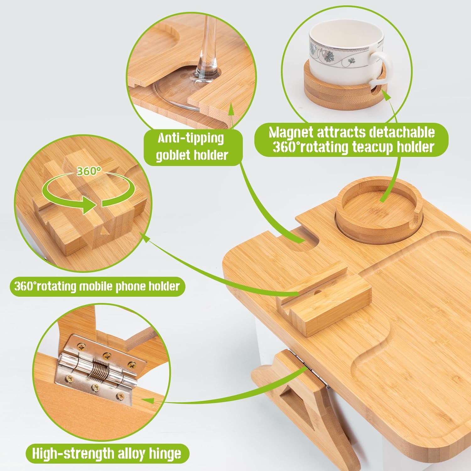 Natural Solid Bamboo Sofa Table Tray Clip on Side Table with Rotatable Mobile Phone Holder and Magnet attracts Detachable Teacup and Goblet Holder Ideal for Home and Leisure Entertainment