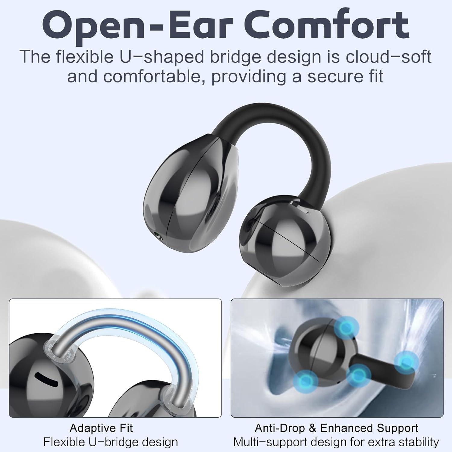 Open Ear Earbuds, Air Conduction Headphones Wireless Earbuds Bluetooth 5.4, Clip on Headphones with Mic 42H Playtime, Over Ear Earphones Comfortable for Sports, Running, Workouts and Glasses Wearers