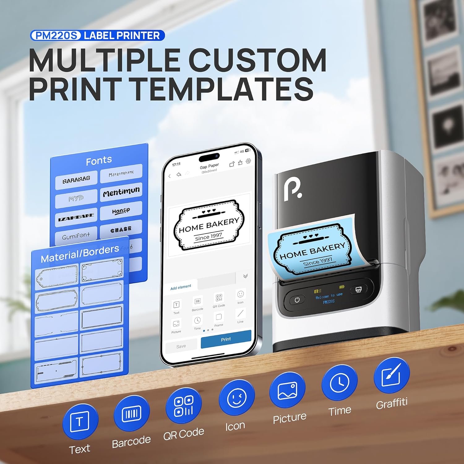 - 【Feature-Rich App】PM220S label maker machine with tape comes with label templates and can set up your own templates.The label printer app supports QR codes, barcodes, tables, text, icons, and more. Enjoy 90+ fonts, 14+ languages, and 450+ material presets. Pro tip: Use our specialized labels for optimal results—avoid tearing the green back sticker to prevent printing issues.