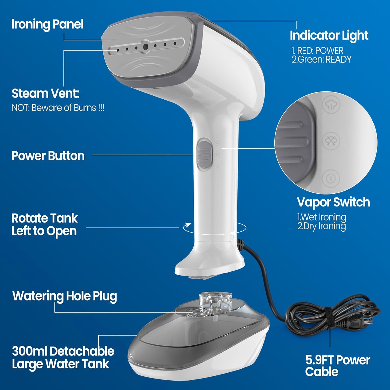 - Versatile and convenient - With a 300ml detachable water tank, this iron steamer can be used for both dry and wet ironing. Its 360-degree orientation design ensures no water leakage during use.