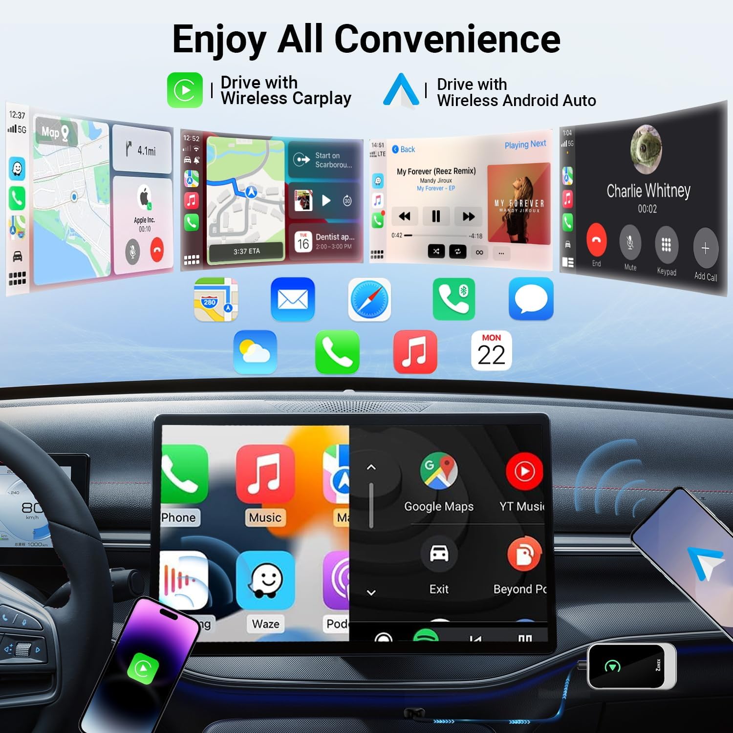 - Upgraded Wireless Carplay Adapter. Our Wireless Carplay Adapter for Apple is compatible with a wide range of vehicle models and supports all stock apps that are compatible with CarPlay or Android Auto, such as GPS Navigator for Car, Siri Assistant, phone calls, and other features. iPhone Wireless CarPlay Adapter makes it easy to convert from wired CarPlay to wireless CarPlay with minimal effort. However, the CarPlay wireless adapter does not support video apps such as YouTube for safe driving.
